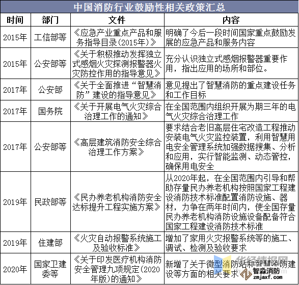 近年來我國密集出臺了消防行業(yè)相關(guān)鼓勵政策,也為行業(yè)長期發(fā)展指明了方向。消防產(chǎn)品向家庭領(lǐng)域的拓展以及智慧消防的快速滲透是未來行業(yè)發(fā)展的必然趨勢。