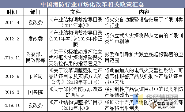 2011年國家發(fā)展和改革委員會發(fā)布《產(chǎn)業(yè)結(jié)構(gòu)調(diào)整指導(dǎo)目錄(2011年本)》,將火災(zāi)報(bào)警控制器列入限制類項(xiàng)目,意味著不允許出現(xiàn)新進(jìn)入者。隨后相關(guān)領(lǐng)域市場化改革穩(wěn)步推進(jìn),開放力度不斷加大。2013年國家發(fā)改委對《指導(dǎo)目錄》進(jìn)行調(diào)整,將獨(dú)立式火災(zāi)探測器從之前的限制類中剔除;2019年限制類第十五類消防所涵蓋的全部產(chǎn)品移出限制類,改為允許類。