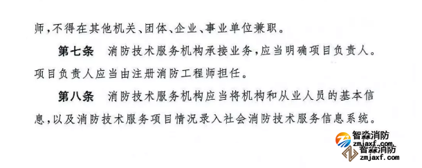 第七條 消防技術(shù)服務機構(gòu)承接業(yè)務,應當明確項目負責人。項目負責人應當由注冊消防工程師擔任。