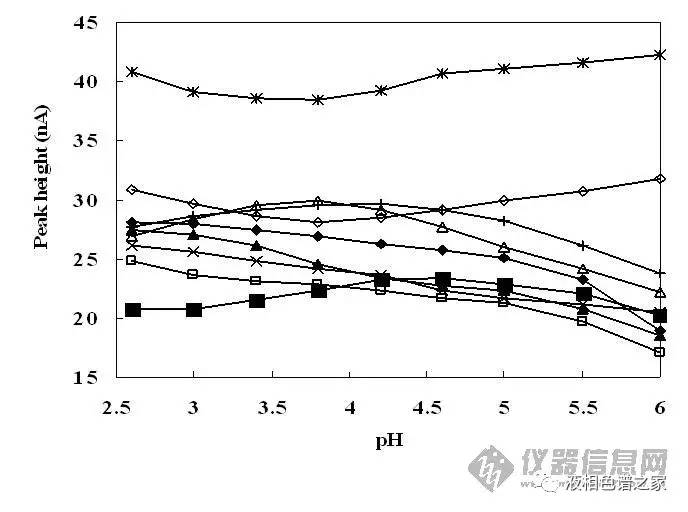 3)流動相pH值改變可以改變樣品的峰高,即可以調(diào)整峰形。