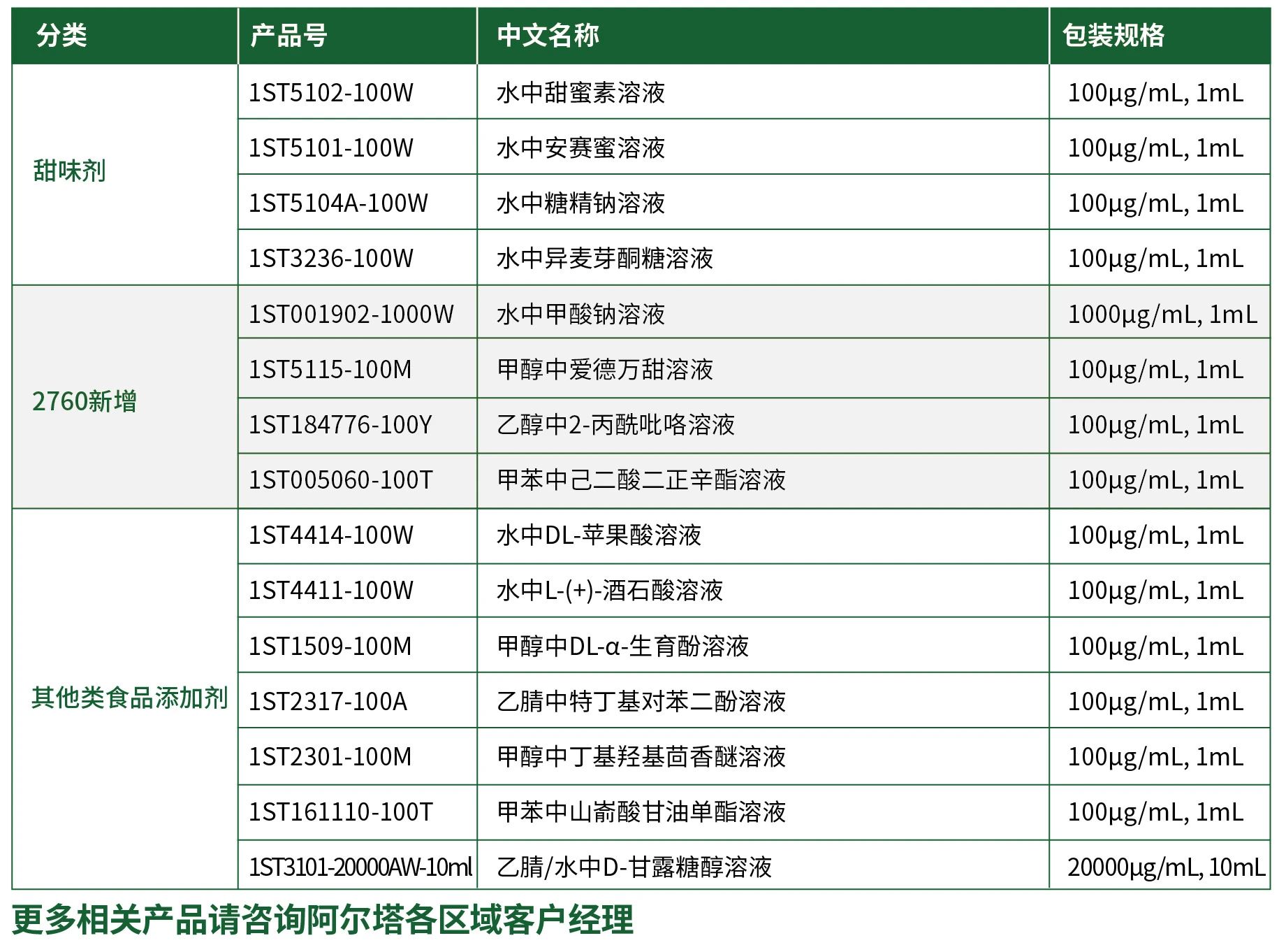 阿爾塔科技作為CNAS認可的國產標準物質生產者,結合國家及行業(yè)相關檢測標準,推出食品添加劑檢測標準物質解決方案,為保障食品安全提供技術支撐,推動食品工業(yè)的持續(xù)發(fā)展。
