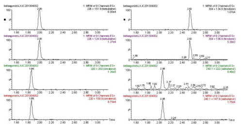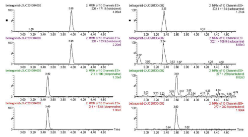 9 種β- 受體激動(dòng)劑特征離子質(zhì)量色譜圖: