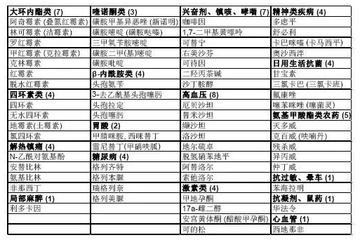 其它藥品和護(hù)理品: 精神類 (15), 糖尿病類 (6), β-Blocker (4), 哮喘、鎮(zhèn)咳 (5), 興奮劑 (4), 心血管類 (12),廣譜抗菌 (7), 解熱鎮(zhèn)痛 (6), 胃酸和抗凝劑 (3);
