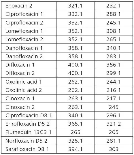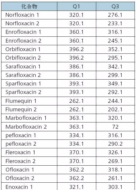 通常建立液質(zhì)聯(lián)用(LC-MS/MS)方法時(shí)需要使用標(biāo)準(zhǔn)品進(jìn)行MRM質(zhì)譜方法優(yōu)化,包括母離子、子離子以及相應(yīng)的電壓參數(shù),費(fèi)錢、費(fèi)時(shí)、費(fèi)力。本方法針對GB/T 20751-2006中喹諾酮類藥物及其內(nèi)標(biāo),建立了MRM離子對信息、質(zhì)譜參數(shù)、液相條件,省去了優(yōu)化步驟,可直接用于水產(chǎn)品中喹諾酮類藥物的測定。