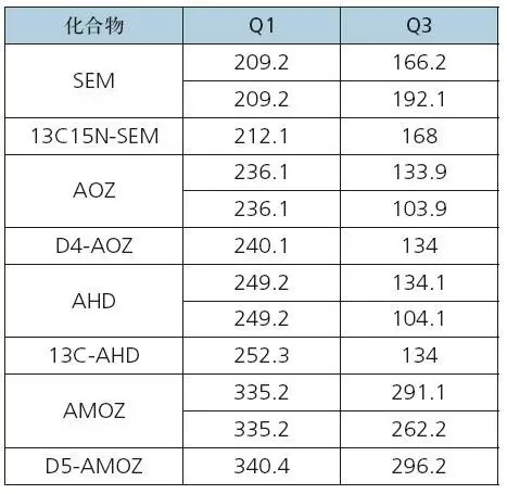 通常建立液質(zhì)聯(lián)用(LC-MS/MS)方法時需要使用標準品進行MRM質(zhì)譜方法優(yōu)化,包括母離子、子離子以及相應的電壓參數(shù),費錢、費時、費力。本方法針對農(nóng)業(yè)部783號公告-1-2006中硝基呋喃代謝物及其內(nèi)標,建立了MRM離子對信息、質(zhì)譜參數(shù)、液相條件,省去了優(yōu)化步驟,可直接用于水產(chǎn)品中硝基呋喃代謝物殘留量的測定。