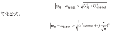 如果實驗室對標(biāo)準(zhǔn)物質(zhì)的測量值超出了標(biāo)準(zhǔn)物質(zhì)特性量值的不確定度范圍,是不能直接得出測量結(jié)果存在偏差的結(jié)論的,原因是標(biāo)準(zhǔn)物質(zhì)的不確定度U標(biāo)準(zhǔn)物質(zhì)僅包括了與標(biāo)準(zhǔn)物質(zhì)定值、均勻性、穩(wěn)定性有關(guān)的不確定度,沒有涉及用戶在實驗室里對標(biāo)準(zhǔn)物質(zhì)進(jìn)行測量有關(guān)的隨機不確定度U測。因此,應(yīng)采取以下通用公式判斷標(biāo)準(zhǔn)物質(zhì)測量值與標(biāo)準(zhǔn)值之間存在顯著偏差: