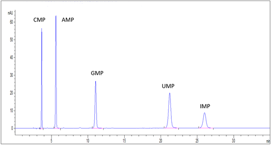 圖1.Venusil ® C18 Plus色譜柱5種核苷酸混標高效液相色譜圖