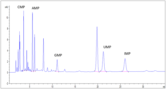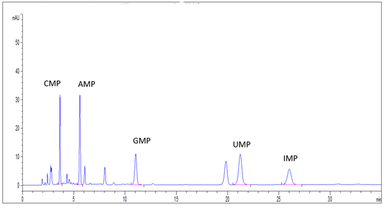 5種核苷酸混合標準溶液:分別稱取核苷酸標準品CMP、AMP、UMP各10mg、GMP、IMP各5mg(精確至0.1mg),用水溶解成并定容至100mL,混勻,即得;