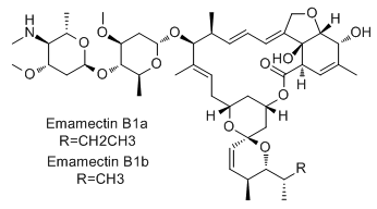 Emamectin (Emamectin B1a-Emamectin B1b mix),是一個混合物,由Emamectin B1a(CAS#121124-29-6 ,C49H75NO13,886.12)和Emamectin B1b(CAS#121424-52-0 ,C48H73NO13,872.10)組成。Emamectin B1a為主要成分